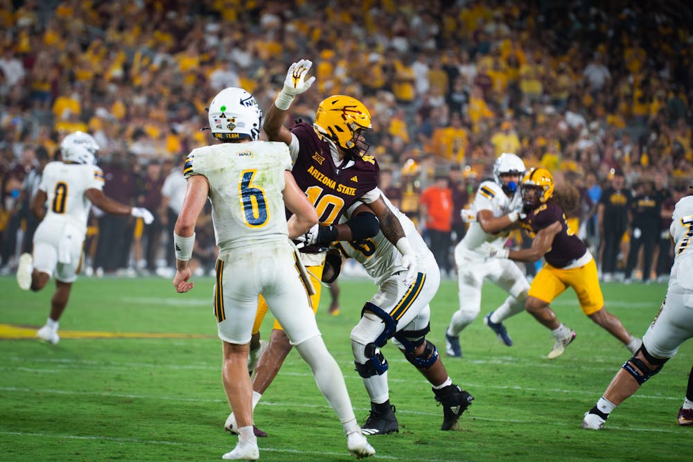 Then ASU redshirt senior defensive lineman Clayton Smith (10) tries for an interception against Texas State on Saturday, Sep. 13, 2025, at Mountain America Stadium in Tempe. ASU won 34-15.