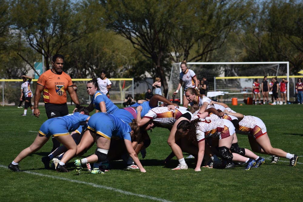 ASU women's rugby forwards in a scrum against UCLA on Saturday, Feb. 14, 2026 at the Polytechnic campus fields in Mesa. ASU won 45-3.