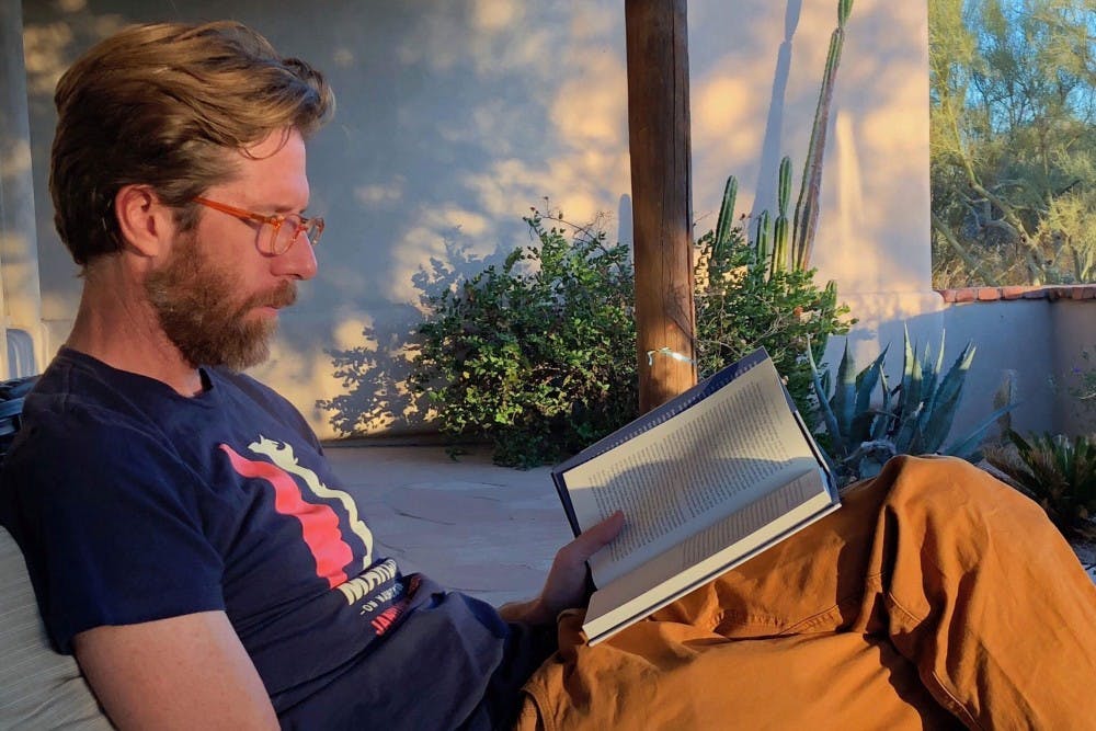 ASU literature professor Chris Hanlon reads a book in Cave Creek, Arizona, in January of 2018.