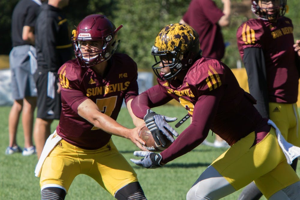Freshman Quarterback Brady White hands the ball off to sophomore Runningback Kalen Ballage during practice at Camp Tontozona Thursday August 13, 2015. (Jacob Stanek/The State Press)