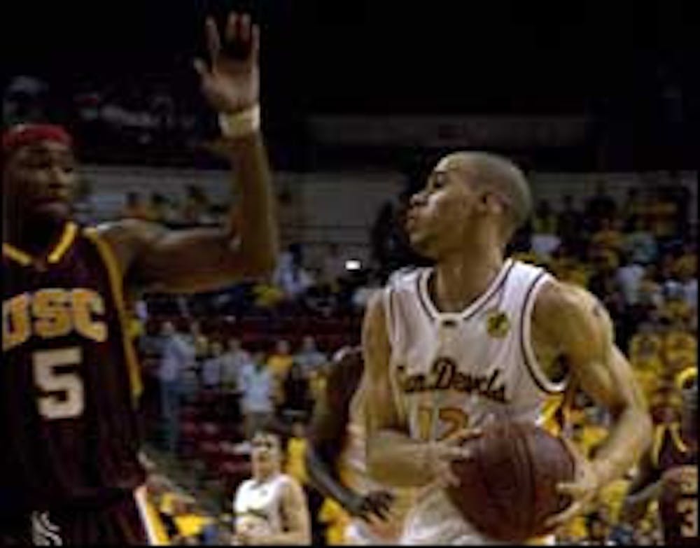 ASU Sophomore swingman Bryson Krueger looks for an opening around USC senior forward Jeff McMillan as ASU lose 98-94 at Wells Fargo Arena.