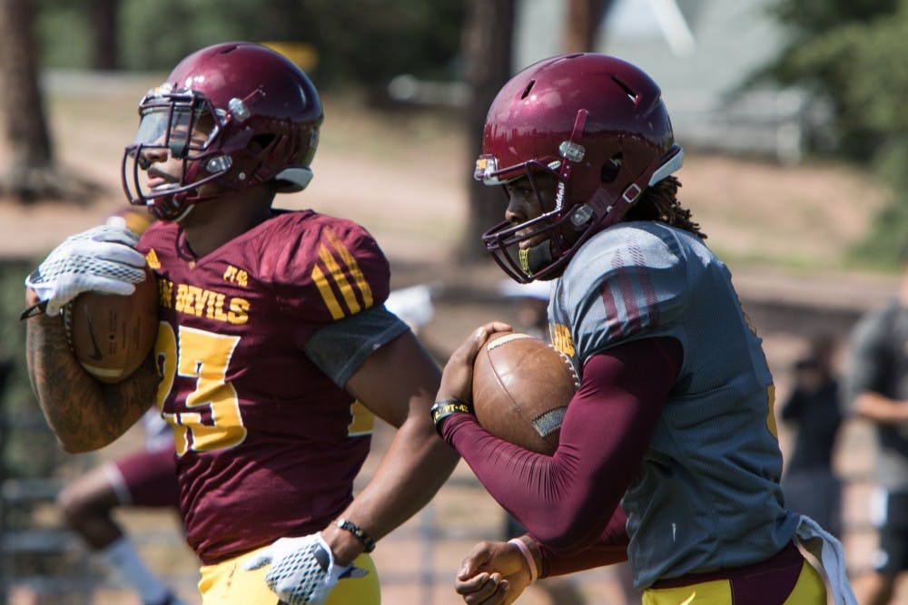 Freshman Runningback Jason Lewis (Left) and freshman Quartback Bryce Perkins (right) hustle during Camp Tontozona practice Wednesday August 12, 2015 at Rumsey Park in Payson, Arizona. (Jacob Stanek/The State Press)