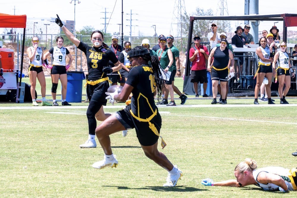 Founder of the ASU Women's Club Flag Football team Sierra Smith (19) runs with the ball while Khalia Dana (3) runs alongside her during the Fiesta Bowl Flag Football Classic on Saturday, April 18, 2026, in Tempe.