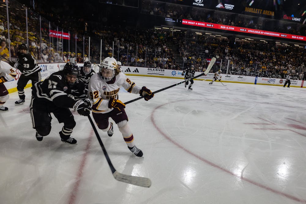 Senior forward Ryan Kirwan (92) fights for the puck at Mullet Arena on Saturday, Feb. 22, 2025, in Tempe. ASU lost 4-3 in overtime.
