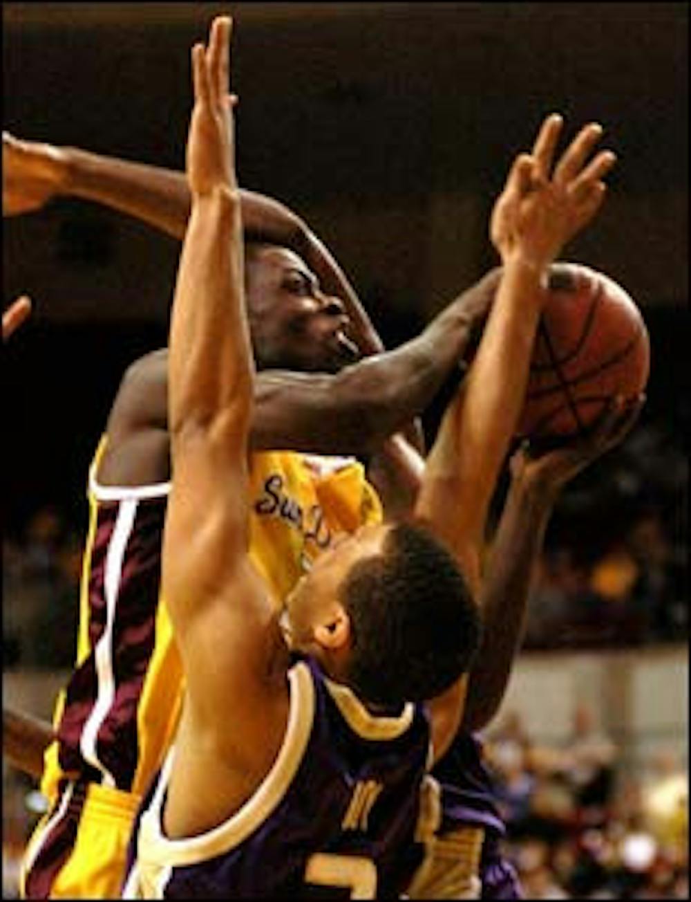 ASU senior guard Steve Moore puts up a shot over Washington junior guard Brandon Roy on Sunday at Wells Fargo Arena.