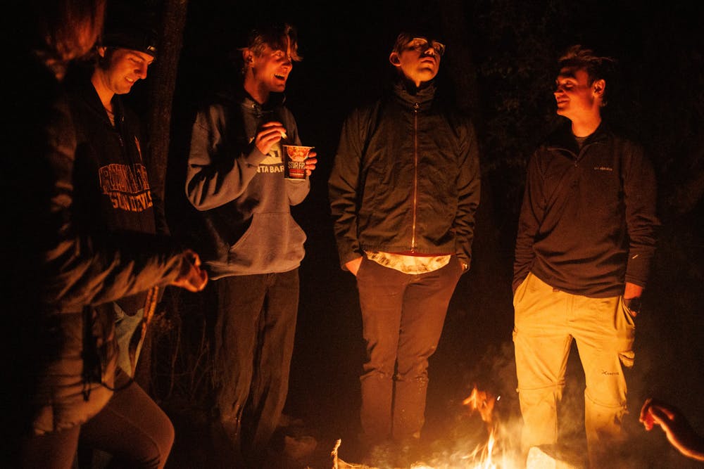 From left to right, Arizona Outdoors Club members Samuel Ingram, Jaddison Jordan, Will Green and Justin Weidmann gather around a campfire outside the Chiricahua National Monument on Saturday, April 5, 2025 in Willcox, Arizona.