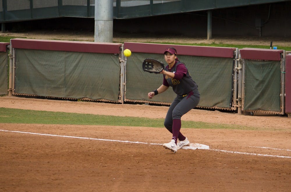 ASU senior Bethany Kemp catches the ball to run out Toledo’s Kylie Gross. ASU won decisively by a score of 11-2. (Shiva Balasubramanian/ The State Press)