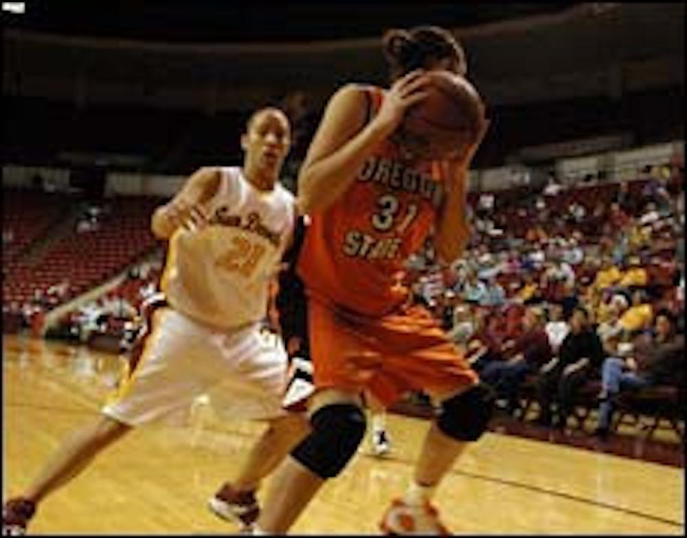 Freshman guard Jacquelyn Johnson guards Oregon State junior guard Anita Rivera at Wells Fargo Arena on Thursday.