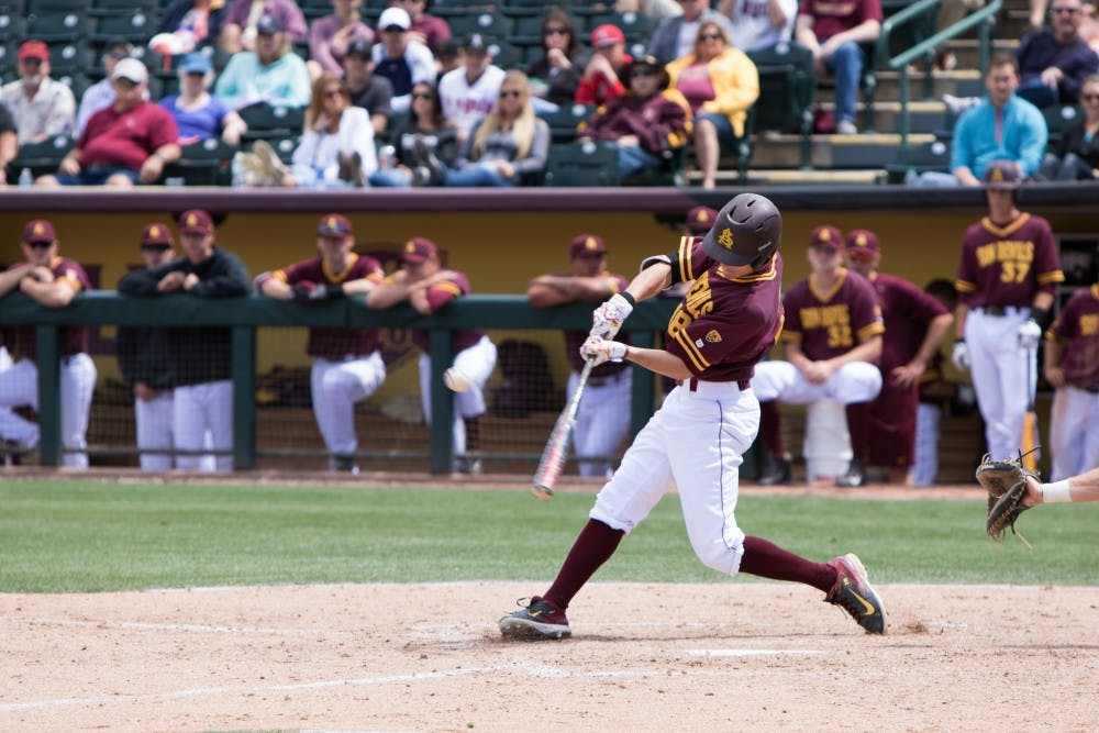 Junior Johnny Sewald hits for a ground-rule double in the bottom of the fifth inning against Tennessee Tech at Phoenix Municipal Stadium Sunday April 26, 2015. The Sun Devils defeated the Golden Eagles 16-4.