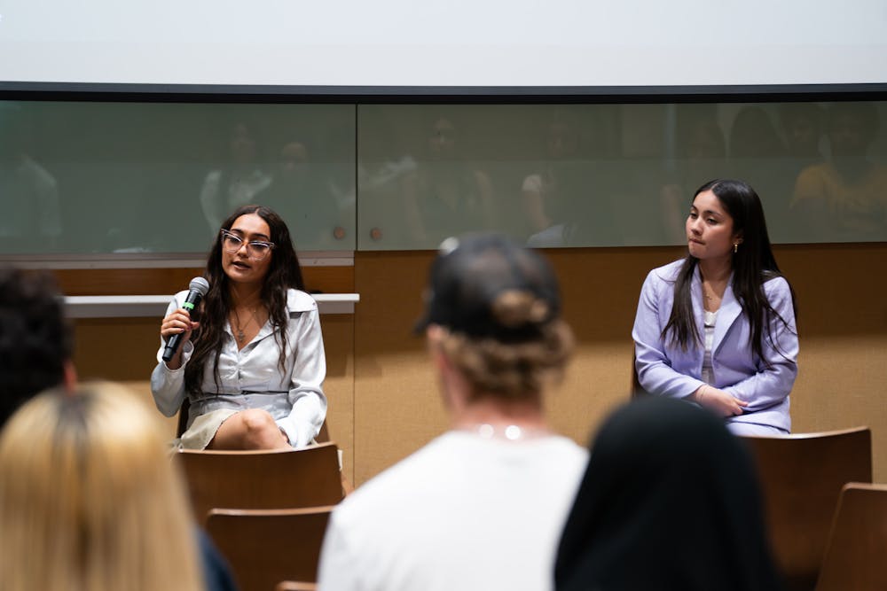 Undergraduate Student Government Downtown student body president candidate Rei Tedoco (left) and Katie Ritchie (right) speaking at the USGD debate at the Student Center at The Post Office on Monday, Mar. 23, 2026 in Downtown Phoenix.