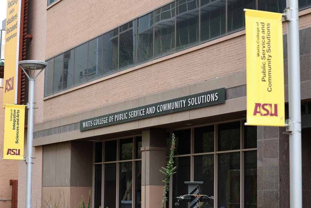 Watts College signage outside of the University Center on ASU's downtown Phoenix campus on Monday, Feb. 16, 2026, in Phoenix.