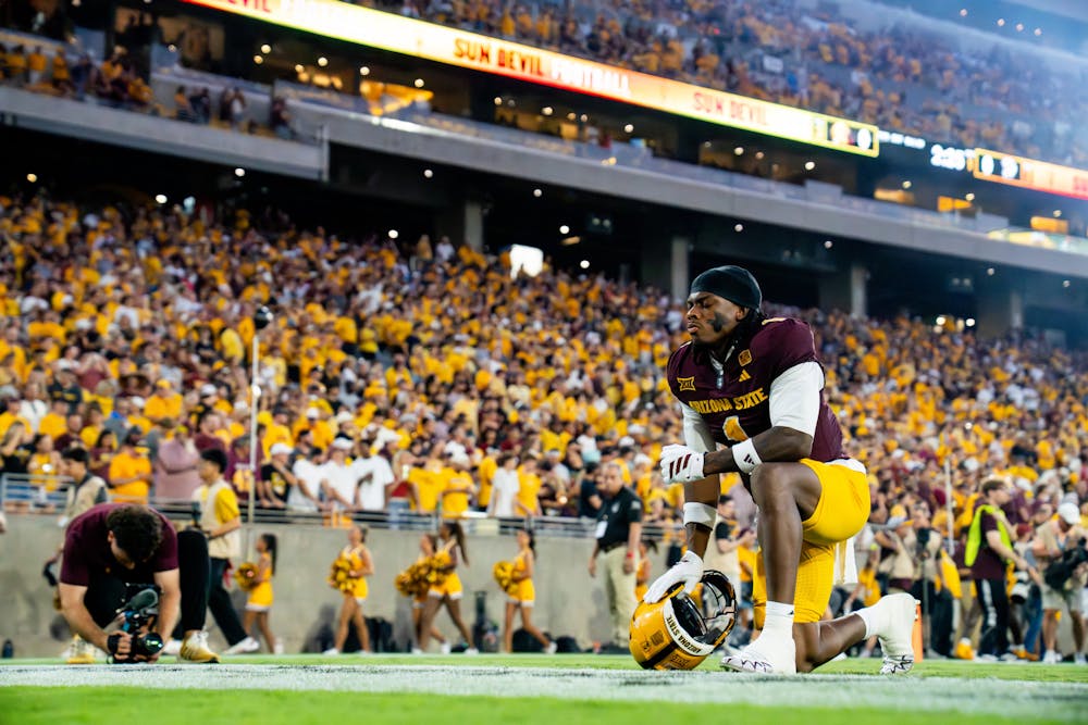 Junior running back Kyson Brown (1) takes a moment on the sideline before a game against Northern Arizona on Sunday, Aug. 31, 2025, at Mountain America Stadium in Tempe. ASU won 38-19.