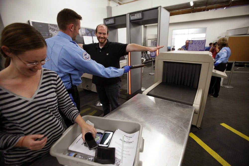 Student Matthew Patterson, right, is wanded by Joe McHugh, who performs as a TSA agent, while Patterson's wife Kalani collects her possessions after passing through a metal detector during a fear of flying class at Air Hollywood in Pacoima, Calif., on Aug. 16, 2014. The Patterson's took the class in the hopes of overcoming their fear of flying. After passing through the metal detector, students make their way to an airplane simulator. (Genaro Molina/Los Angeles Times/MCT)