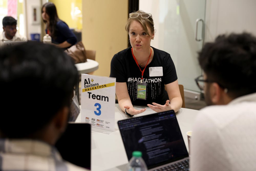 Dr. Allison Lester speaks to AI Hackathon team at the downtown Student Center on Thursday, Feb. 26, 2026, in Phoenix.