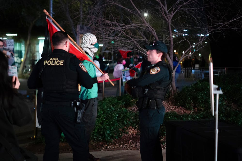 Protestor holding a flag next to ASU Campus Police at Sandra Day O'Connor Law School protesting the Free Speech Panel on Thursday, Jan. 30, 2025 in Phoenix.