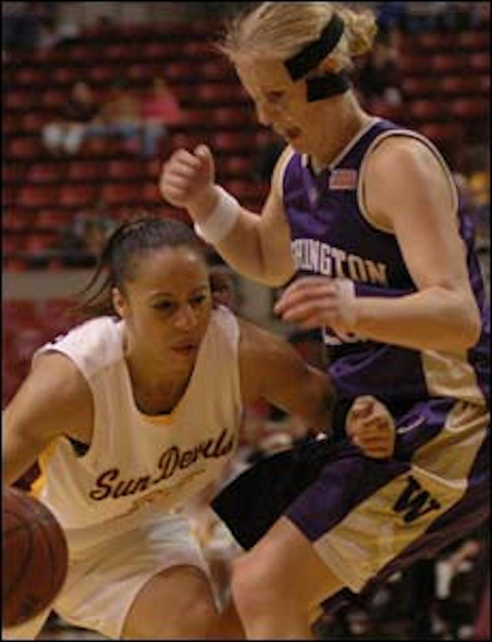 ASU senior guard Carrie Buckner drives into Washington junior guard Kayla Burt Thursday during the Sun Devils' 69-48 win at Wells Fargo Arena.