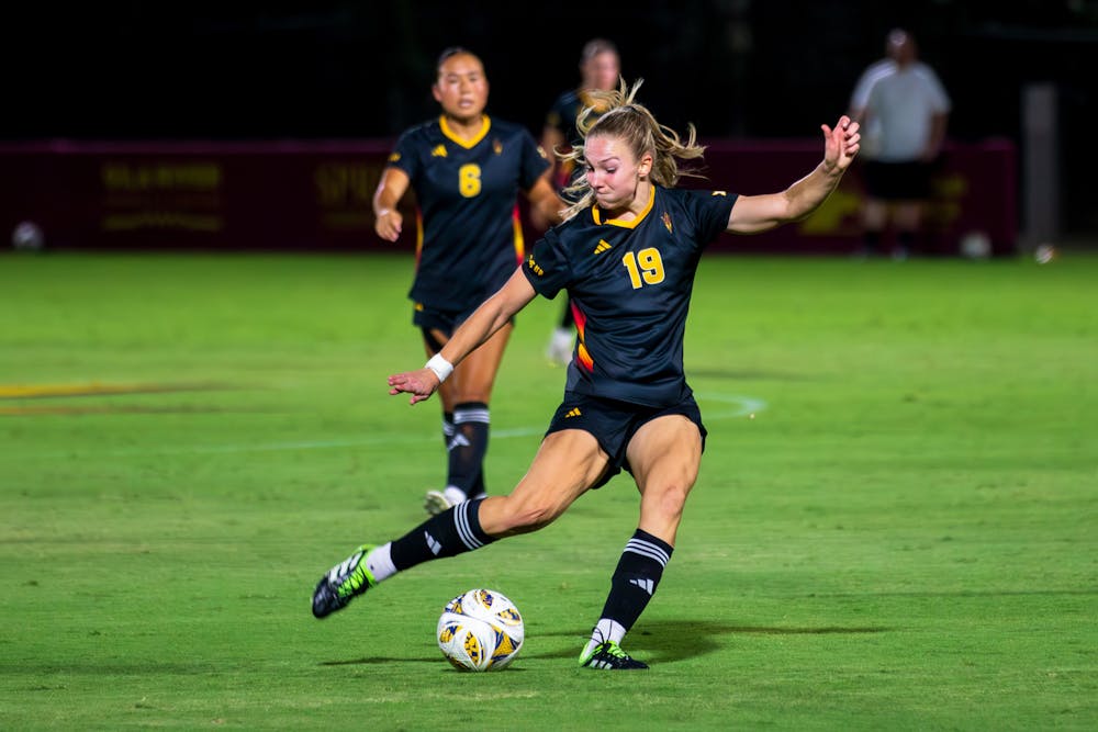 ASU midfielder/forward Sierra Bergen (19) kicks the ball on Thursday, Sept. 25, 2025, at Sun Devil Soccer Stadium in Tempe. ASU tied 0-0.