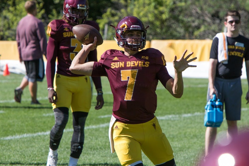 Freshman Quarterback Brady White passes the ball during practice at Camp Tontozona Thursday August 13, 2015. (Jacob Stanek/The State Press)