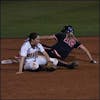 Freshman shortstop Rhiannon Baca, left, cuts off a throw Wednesday night as senior right fielder Allyson Von Liechtenstein slides into second base. UA topped ASU 1-0 for its 10th consecutive win in the rivalry.