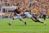 ASU redshirt senior tight end Chamon Metayer (7) runs past defenders for a touchdown during a game against West Virginia at Mountain America Stadium on Saturday, Nov. 15, 2025, in Tempe. ASU won 25-23.