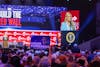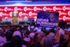 An attendee holds up a sign for the late conservative influencer Charlie Kirk as his former wife, Erica Kirk, speaks at the Build the Red Wall Rally at Dream City Church on Friday, April 17, 2026, in Phoenix.