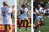 Photo collage of Jordyn Behar (left), Lydia Oldknow (center) and Teagan Ng (right) playing during the 2024-2025 and 2025-2026 lacrosse seasons.