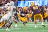 Then-ASU senior running back Cam Skattebo (4) runs through Texas defenders during the College Football Playoff Quarterfinal Peach Bowl in Mercedes-Benz Stadium on Wednesday, Jan. 1, 2024, in Atlanta. ASU lost 39-31.