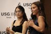 Neida Romero Montes (left) and Olivia Braymiller, candidates for USG-Tempe Vice President of Policy, speaking at the USG Executive Ticket debate at Senita Ballroom on Tuesday, March 25, 2025 in Tempe.