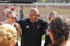 ASU Beach Volleyball Assistant Coach Paul Araiza addresses the team after winning against South Carolina on Saturday, March 29, 2025 at the Sun Devil Beach Volleyball Facility in Tempe. ASU won 4-1.