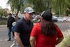 Arizona Sen. Mark Kelly speaks to a demonstrator outside of Gordon Commons on Wednesday, April 9, 2026, in Phoenix.