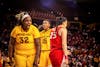 Graduate student center Nevaeh Parkinson (32) celebrates after scoring at Desert Financial Arena on Saturday, March 1, 2025, in Tempe. ASU lost 71-59.