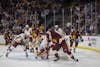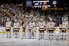 The ASU Sun Devil Hockey starting lineup gather at the start of their match against Minnesota Duluth on Friday, March 14, 2025 at Mullet Arena in Tempe. ASU won 4-3.