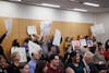 Attendees of the Arizona Board of Regents meeting hold up signs voicing various forms of dissatisfaction with the council in the Memorial Union building on Thursday, Feb. 13, 2025 in Tempe.