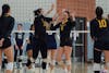 Tenae DeBerg (far left), Zaira Reyes (middle left), Piper Kvanvig (middle right) and Payton Kamisnky (far right) celebrate during the SCCVL Regional League Tournament held at GCU on Saturday, Feb. 7th, 2026, in Phoenix.