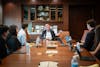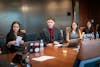 State Press sci-tech editor Kate Gore (left), sports editor Alan Deutschendorf (middle left), digital editor-in-chief Sophia Braccio (middle right) and managing editor Senna James (right) speak with President Michael Crow at the Fulton Center on Tuesday, Mar. 24, 2026, in Tempe.