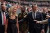 U.S. Defense Secretary Pete Hegseth (right) and his wife, Jennifer Rauchet, in attendance of Charlie Kirk’s memorial service at State Farm Stadium on Sunday, Sept. 21, 2025, in Glendale.