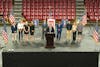 Speakers and organizers stand on stage during a vigil honoring Charlie Kirk at Desert Financial Arena on Monday, Sept. 15, 2025, in Tempe.