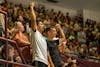 Attendees cheer and raise their fists during a vigil honoring Charlie Kirk at Desert Financial Arena on Monday, Sept. 15, 2025, in Tempe.