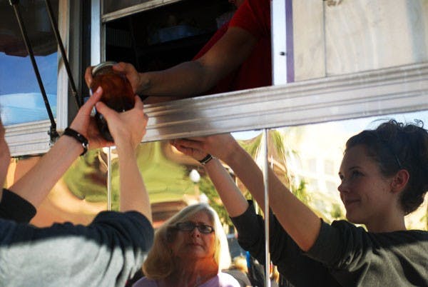 Psychology junior Victoria Teixeira grabs a drink from the Luncha Libre food truck before a final Wednesday afternoon. Luncha Libre and other local food trucks host a block party on Forest Avenue and Sixth Street in Tempe every Wednesday.