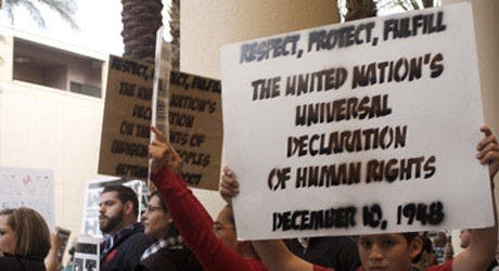 Protesters gathered at various places throughout Phoenix Thursday to express opposition to the implementation ...
